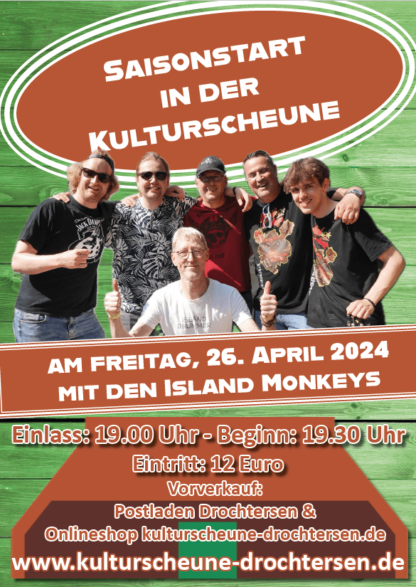 Am 26. April 2024 eröffnen wir die Konzert-Saison in der Kulturscheune Drochtersen. Einlass ist ab 19:00 Uhr und um 19:30 Uhr beginnen wir zu spielen. Wer von euch wird am Start sein? Die Karten gibt es im Vorverkauf im Postladen Drochtersen und im Onlineshop der Kulturscheune.